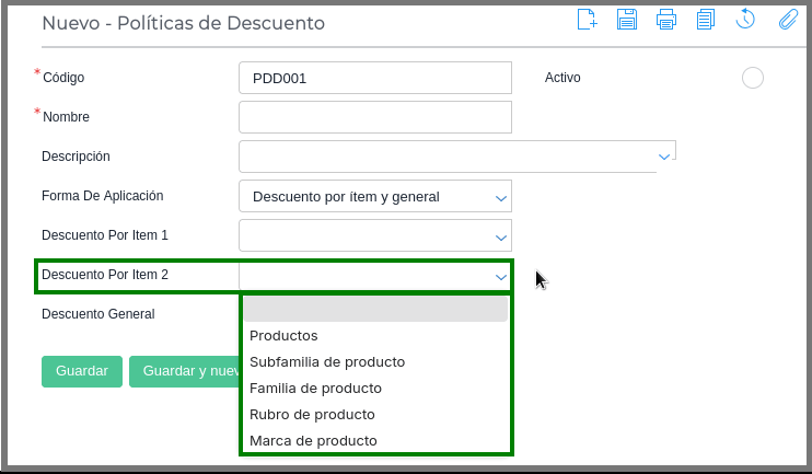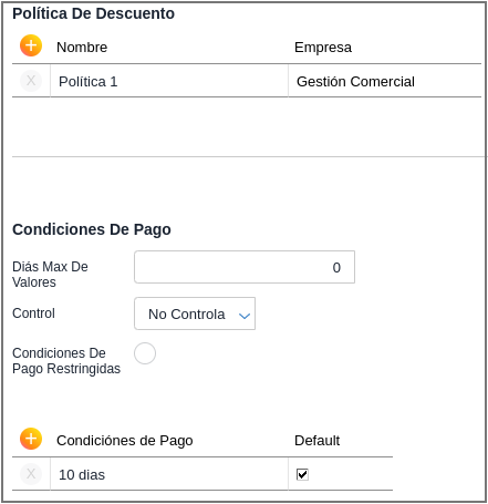 - Empresa: el selector muestra las empresas a las que se puede asignar la política de descuento.