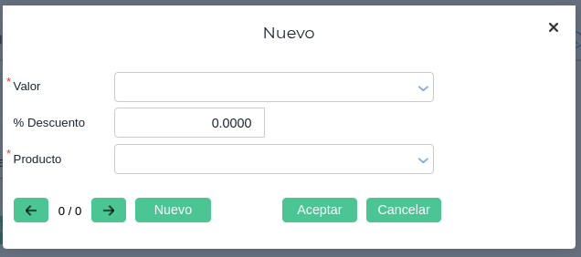 - Productos: el descuento se aplicará al producto seleccionado, perteneciente al maestro de Productos.