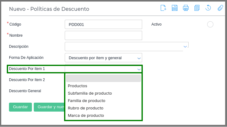 - Nombre: el selector muestra las políticas de descuento previamente creadas y registradas.