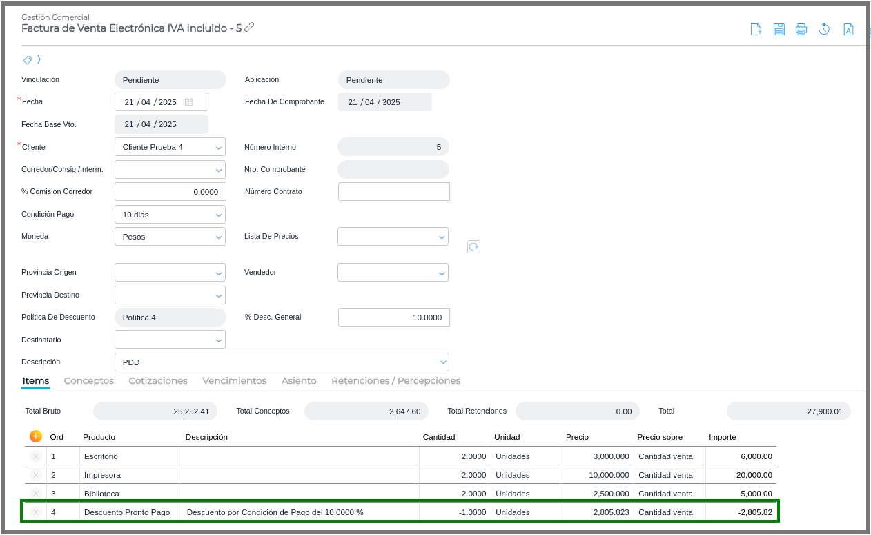 - En este caso, la Política de Descuento tiene un descuento general configurado, por lo que se genera un ítem de descuento al final de todos los productos. Este ítem siempre figurará en último lugar, sin importar los productos que se agreguen. El descuento general se aplica sobre el total de la operación.