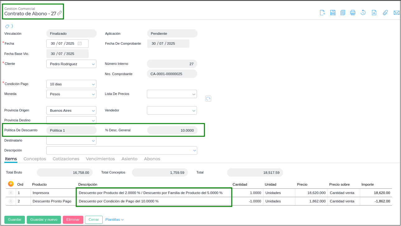 Como se puede visualizar, la Factura de Venta creada a partir del Contrato de Abono, hereda los Descuentos 1, 2 y Descuento general configurados en la Política de Descuento: