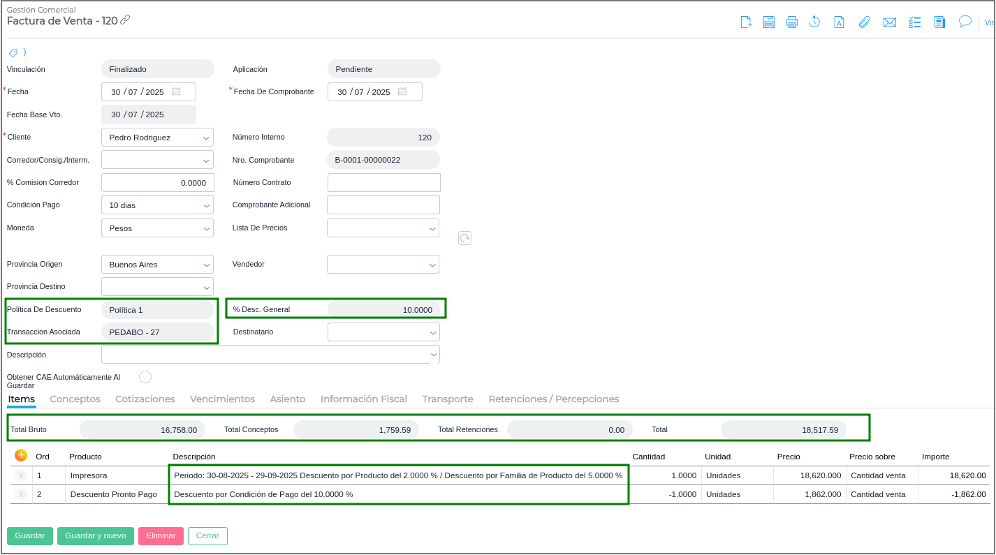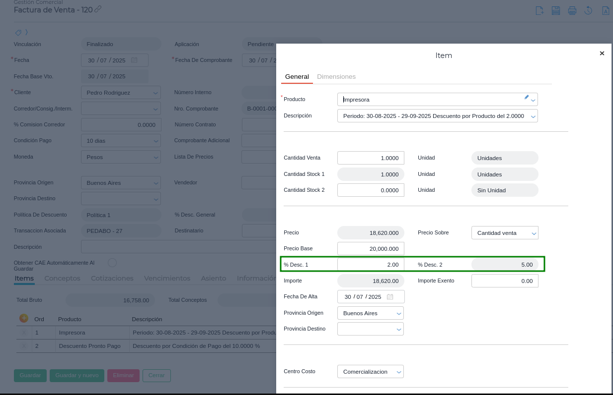 En la operación se visualiza el porcentaje de descuento de este campo en la cabecera de la aplicación y como un nuevo ítem de producto en la solapa “Items”: