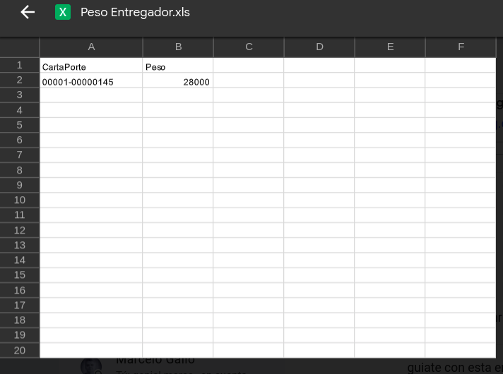 - Validar el campo “Peso entregador” en la carta de porte. En este se evidencia la cantidad de kg definidos en el XLS: