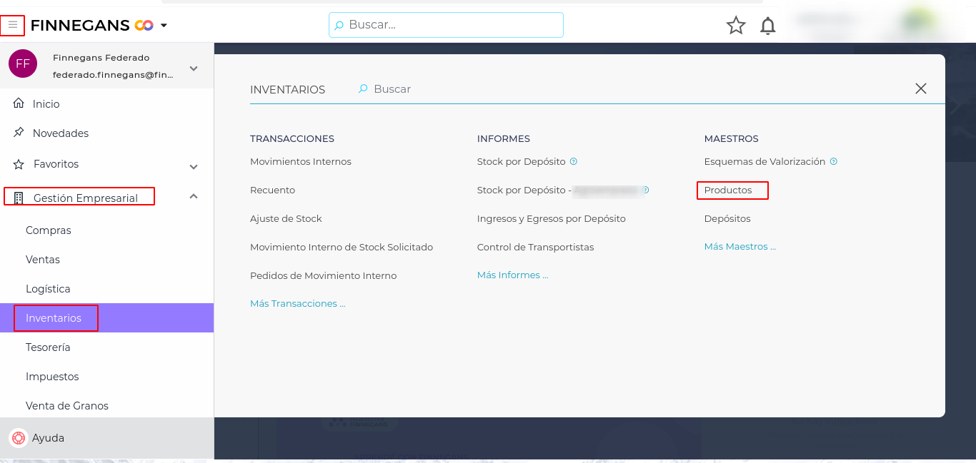 1- Ir desde Menú - > Gestión Empresarial → Inventarios → Productos.