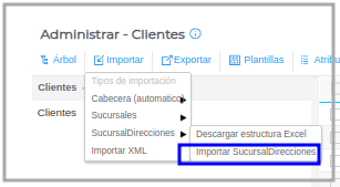 Se presiona nuevamente el botón Importar y se selecciona la opción Cliente SucursalDirecciones.
