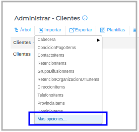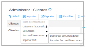 Para importar el archivo, se vuelve a presionar el botón Importar y se selecciona la opción Clientes Sucursales → Importar Clientes Sucursales.