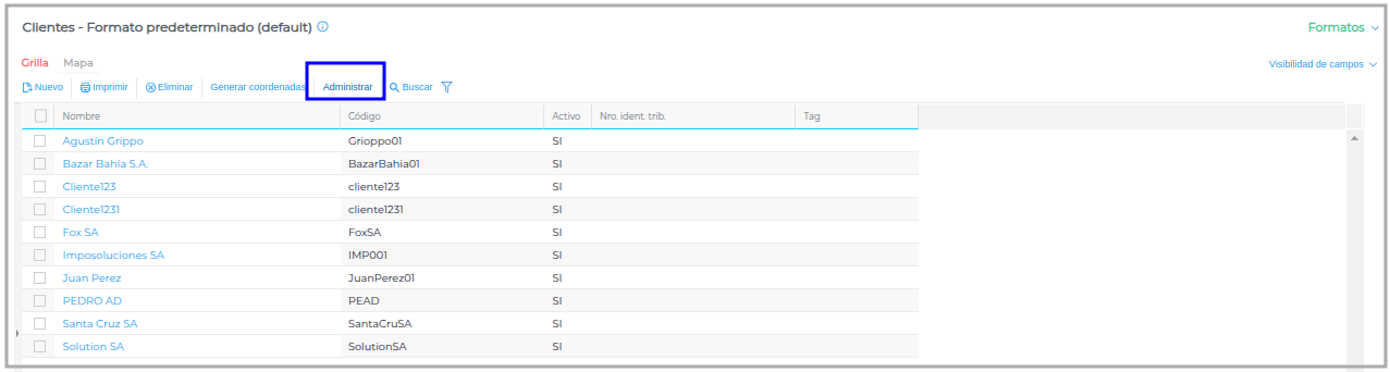 Para descargar la estructura en formato Excel, se debe ingresar al Maestro de Clientes, darle a la opción administrar, presionar el botón