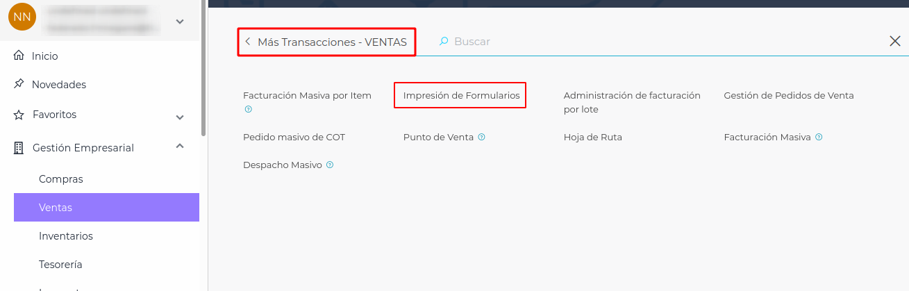1- Ir a Menú > Gestión Empresarial > Ventas > Transacciones > Más transacciones > Impresión de Formularios