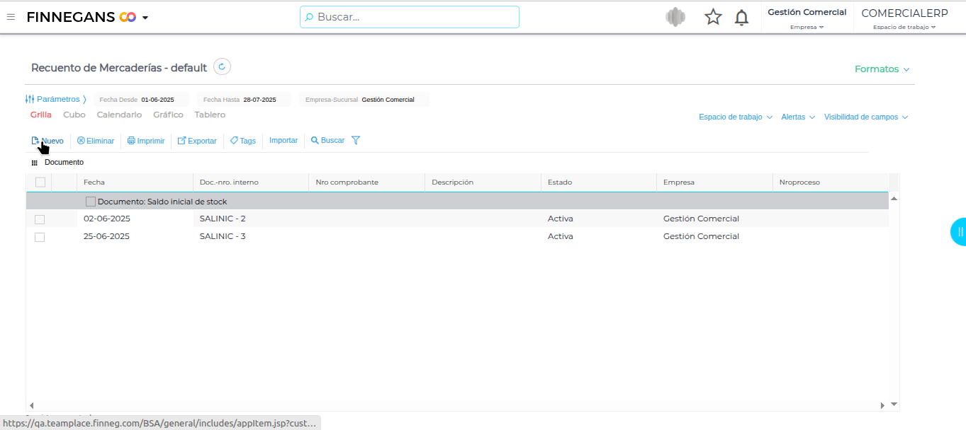- Ir a Menú → Gestión Empresarial → Inventarios → Recuento de Mercaderías y crear un Documento de “Saldo Inicial de stock”: