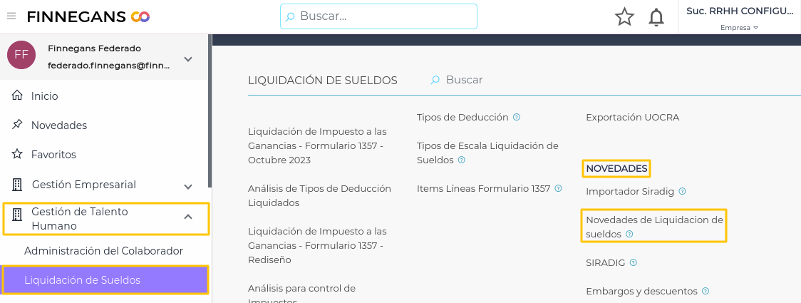 - Ingresar al menú > Gestión de Talento Humano > Liquidación de Sueldos > Novedades > Novedades de Liquidación de Sueldos.