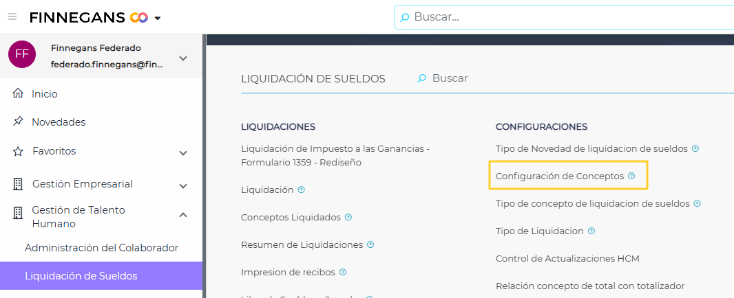 Ingresar al menú > Gestión de Talento Humano > Liquidación de Sueldos > Configuración de Conceptos.
