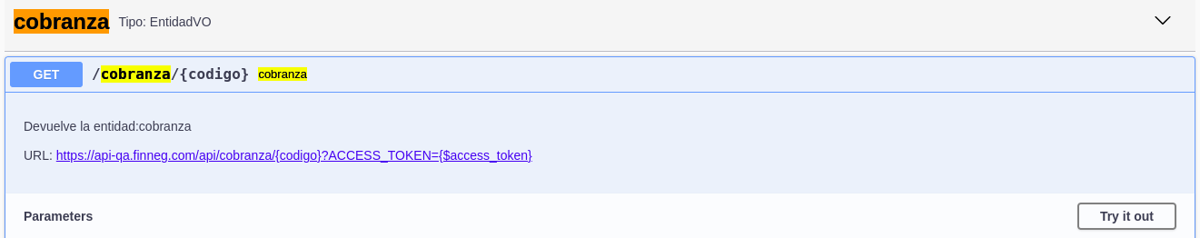 - En este caso tenemos dos métodos GET disponibles para utilizar en la API de cobranza. Para realizar las llamadas en postman debemos copiar el URL que se encuentra en la descripción del método.