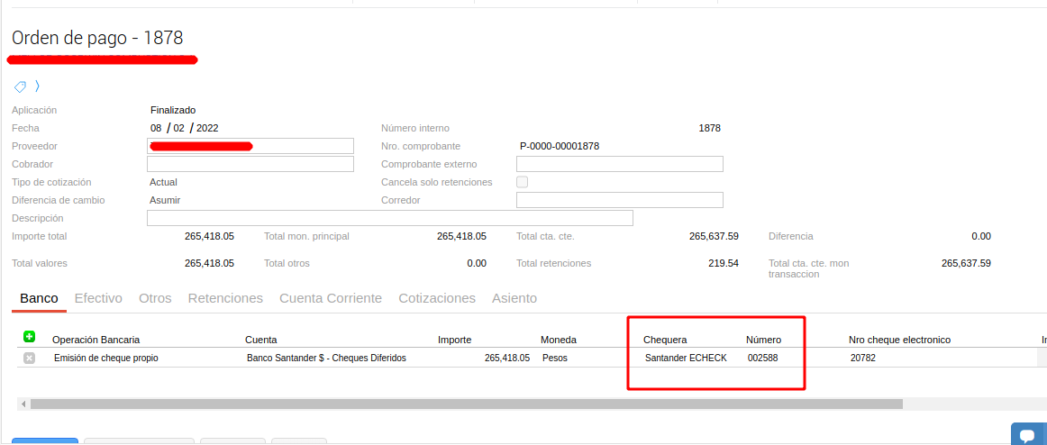 ¿Cómo modificar el número de cheque y de e-cheq que te da el sistema en una orden de pago, por el número de cheque que te da el banco?.