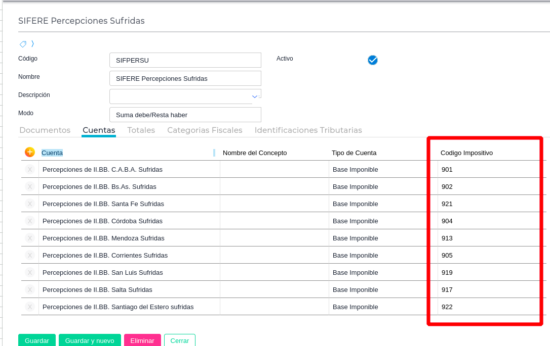 En la solapa cuentas, agregar la percepción IIBB de la provincia y colocar el código que se obtuvo en el paso 3.