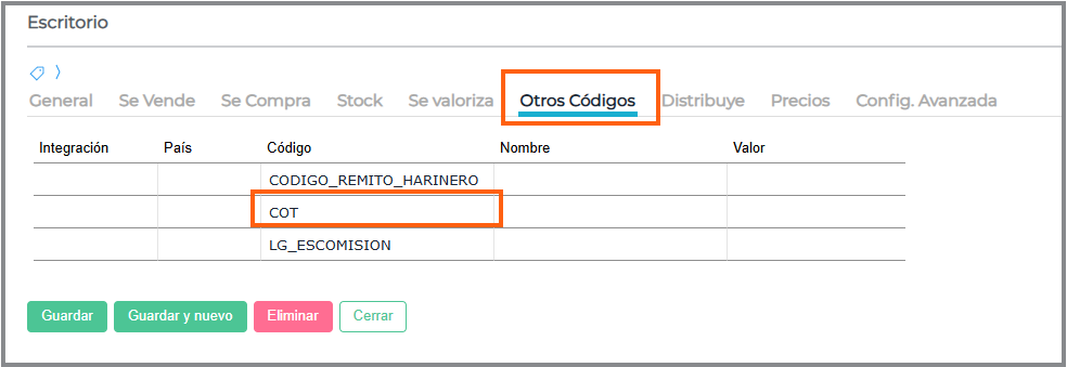 - En la solapa “Otros códigos”, ingresar en “COT”, y registrar el valor del producto según el nomenclador.