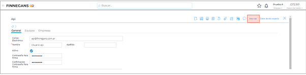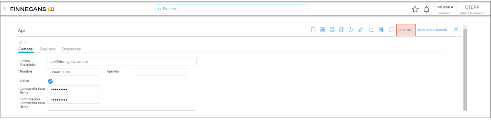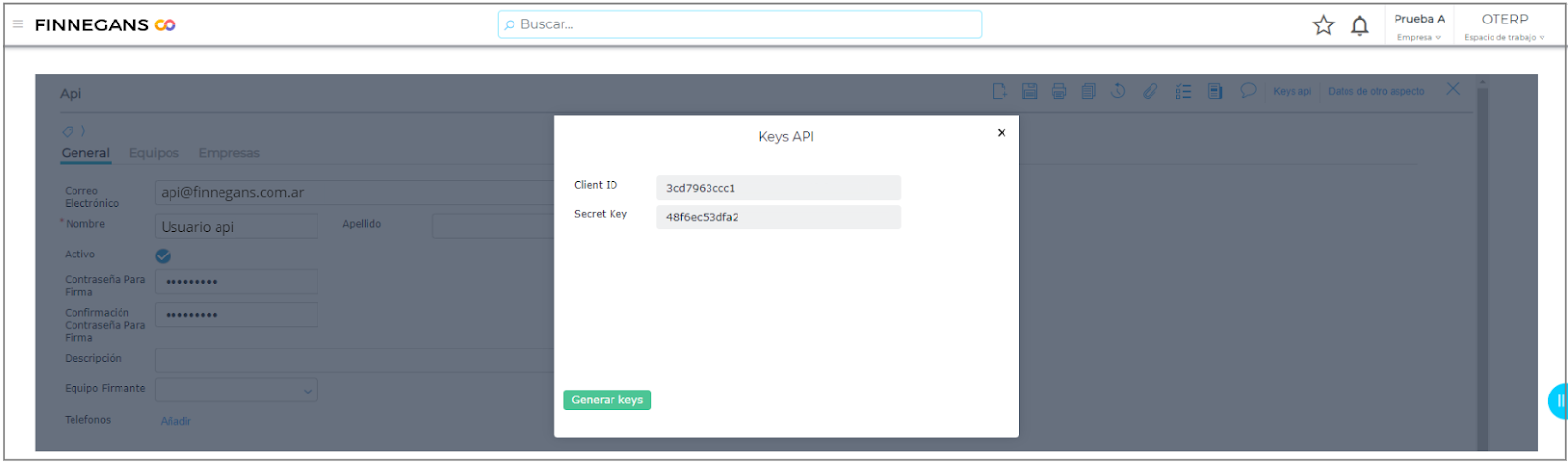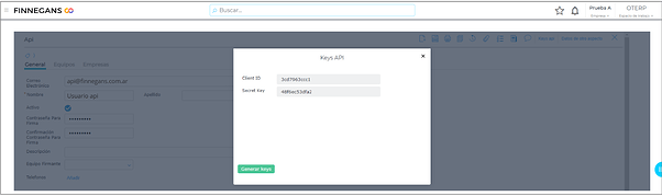 Para obtener dichas credenciales hay que ir al maestro Usuarios (Menú → Configuración → General → Seguridad → Usuarios) y acceder al usuario que se va a utilizar. Dentro del mismo, se debe acceder a la opción Keys api, en la cual se encuentran las credenciales a configurar para la obtención del token.