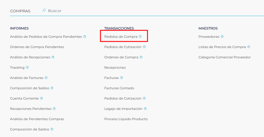 - Ingresar a Gestión empresarial > Compras > Transacciones > Pedidos de compra.