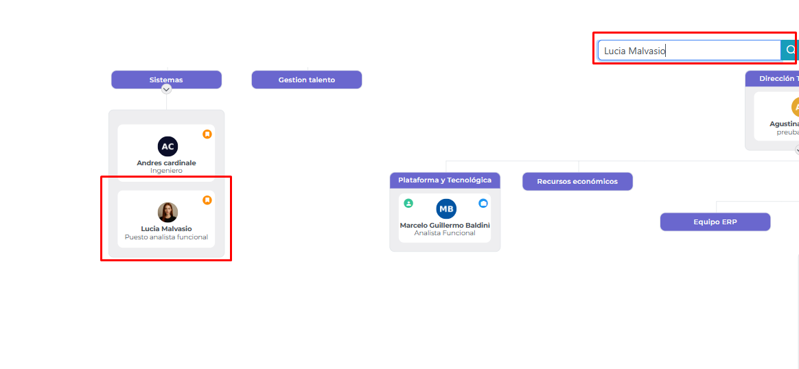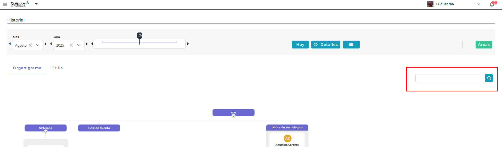 La funcionalidad de búsqueda en el organigrama permite localizar de manera rápida y sencilla a un colaborador, un puesto o un área dentro de la estructura organizacional de la compañía, sin necesidad de recorrer manualmente todo el organigrama.