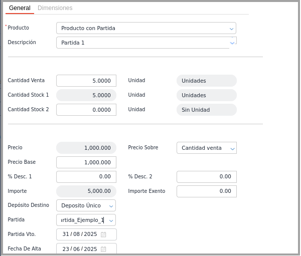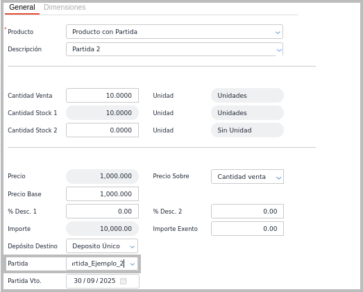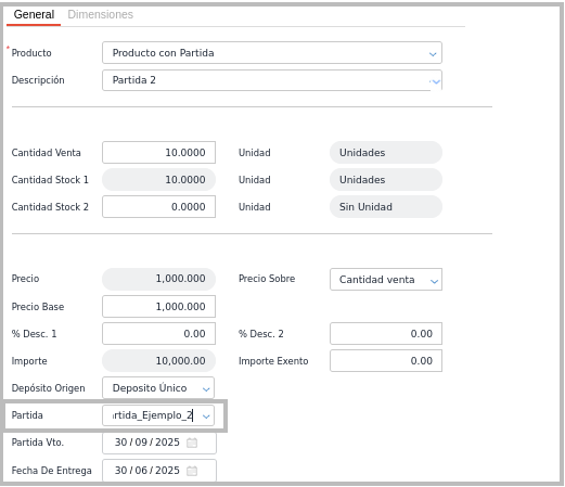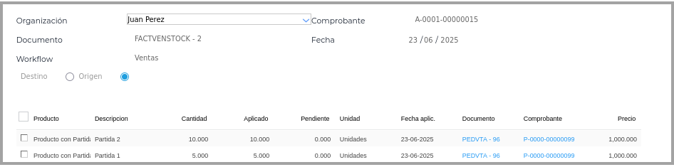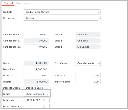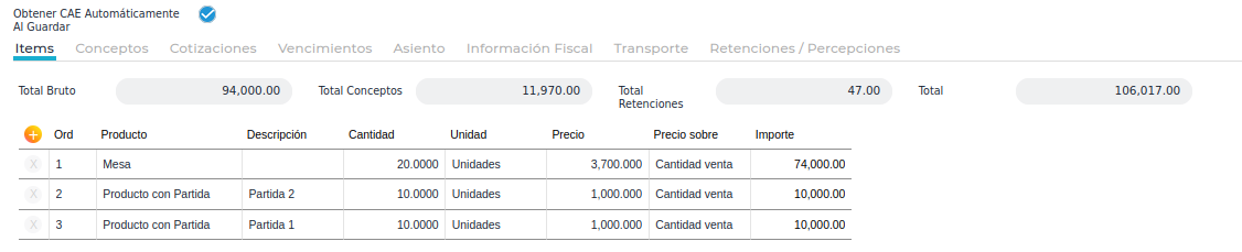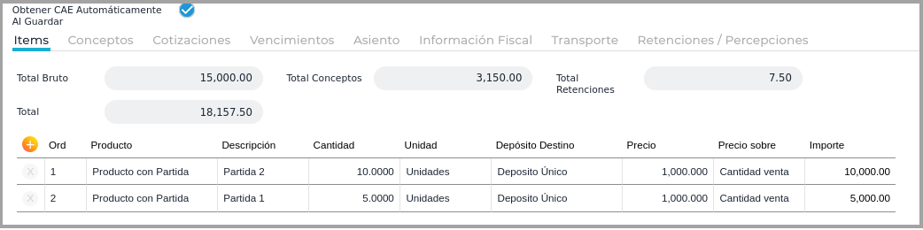 En el caso del Producto con Partida, se crean dos ítems por separado en la factura, ya que el producto con partida, en ambos casos, poseen partidas diferentes, por lo que correspondes a ítems diferentes.