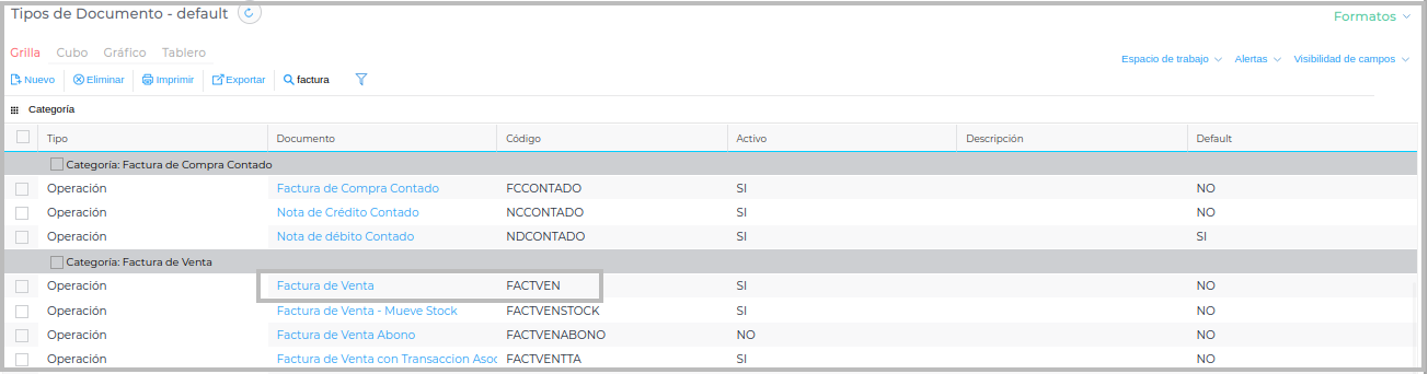 Ir a Menú → Configuraciones → Diseño del Espacio de Trabajo → Tipo de documentos, seleccionar el tipo de documento Factura de venta(FACTVEN)