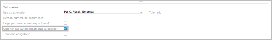 En la sección de Talonarios darle al check de Obtener CAE automáticamente al guardar
