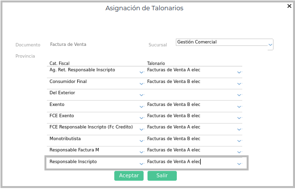 Desde el botón de Asignar talonarios, cargar para cada categoría fiscal un talonario.