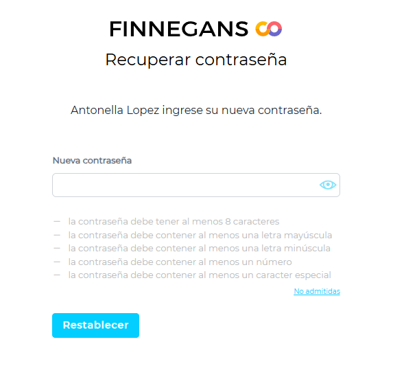 En caso de que el correo electrónico se encuentre activo en Finnegans Go, se visualizará un mensaje de éxito indicando que “Se ha enviado un correo para restablecer la contraseña.”