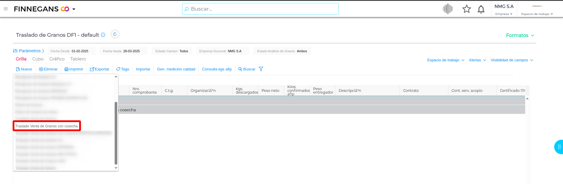 Menú → Gestión empresarial → Venta de granos → Traslado de granos -