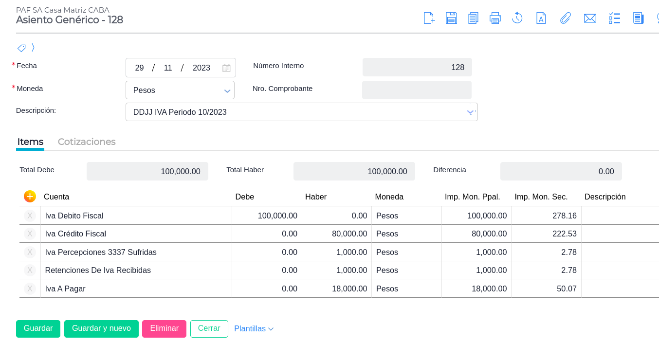 Una vez creadas las cuentas, vamos a utilizar un asiento genérico para cargar las DDJJ, seleccionando las cuenta involucradas.