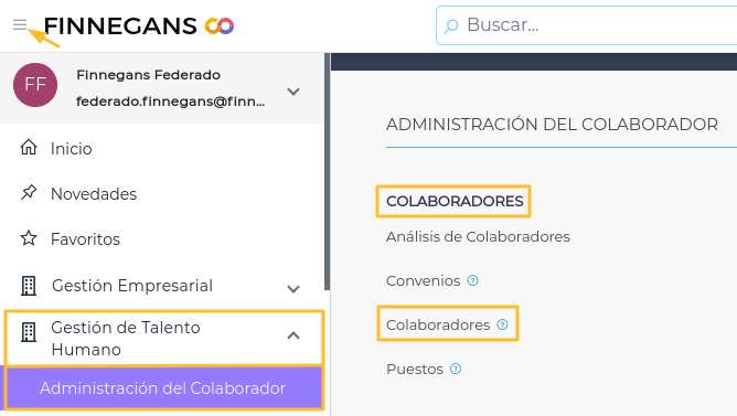 - Ingresar al menú > Gestión del Talento Humano > Administración del Colaborador > Colaboradores.