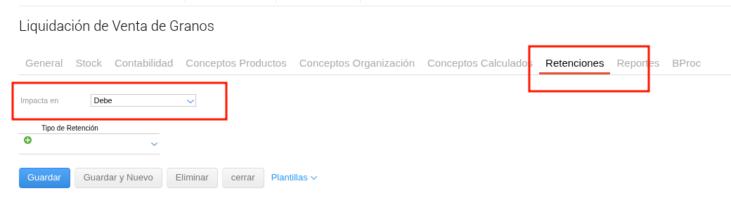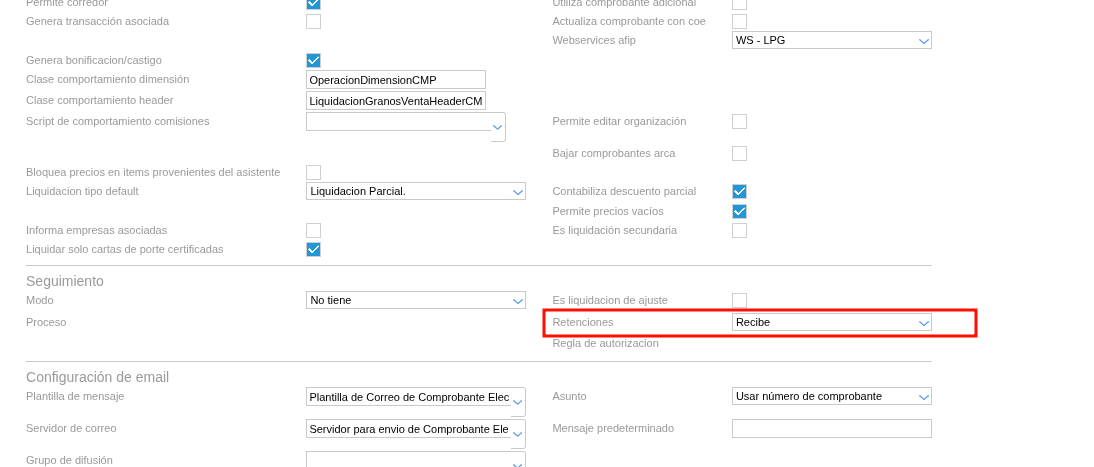 En la solapa General del tipo de documento “Liquidación de Venta de Granos”, el campo Retenciones debe estar configurado como RECIBE: