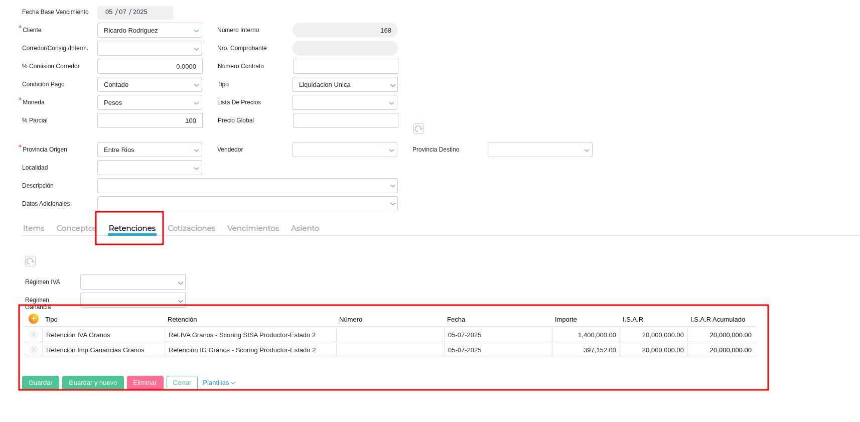 Retenciones preconfiguradas: El sistema ya incluye, de forma estándar, la configuración para las retenciones más comunes como IVA GRANOS y GANANCIAS GRANOS, así como retenciones de Ingresos Brutos para algunas de las principales jurisdicciones provinciales.