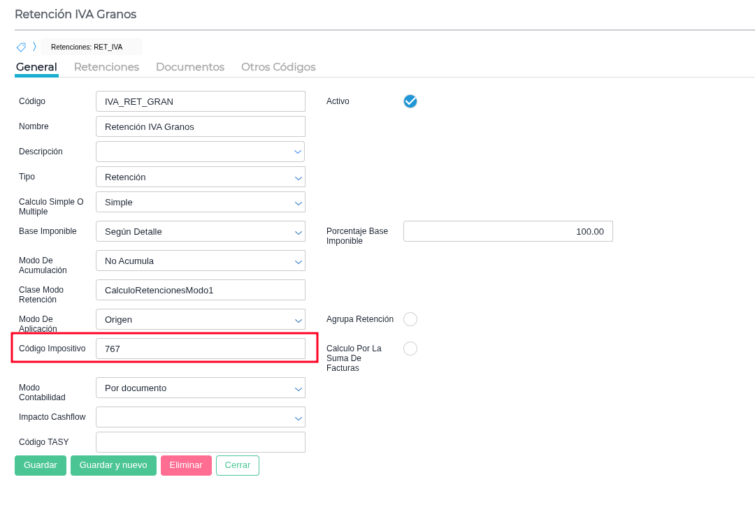Revisión del Tipo de Retención: Es crucial entender que para las retenciones recibidas, el sistema no realiza ningún cálculo automático. El dato más importante a verificar es que el código impositivo sea el correcto, para asegurar que la información se exponga adecuadamente en los aplicativos fiscales correspondientes: