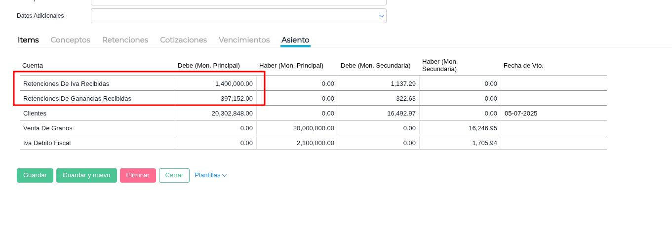 Una vez cargadas todas las retenciones y guardado el comprobante, es importante verificar el asiento contable generado para confirmar que las retenciones sufridas y su impacto se hayan registrado correctamente en las cuentas correspondientes: