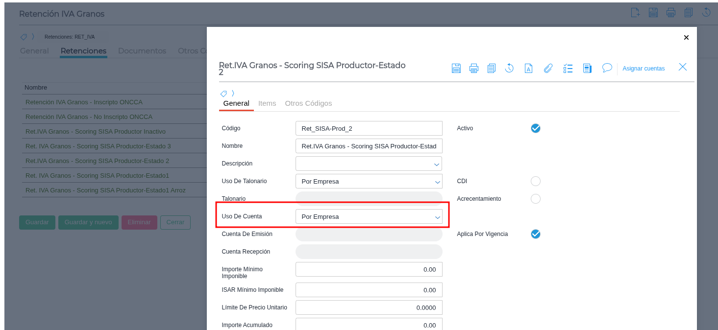 Asignación de cuenta contable: Finalmente, debes verificar cómo se asignará la cuenta contable para registrar la retención sufrida. Tienes dos opciones: