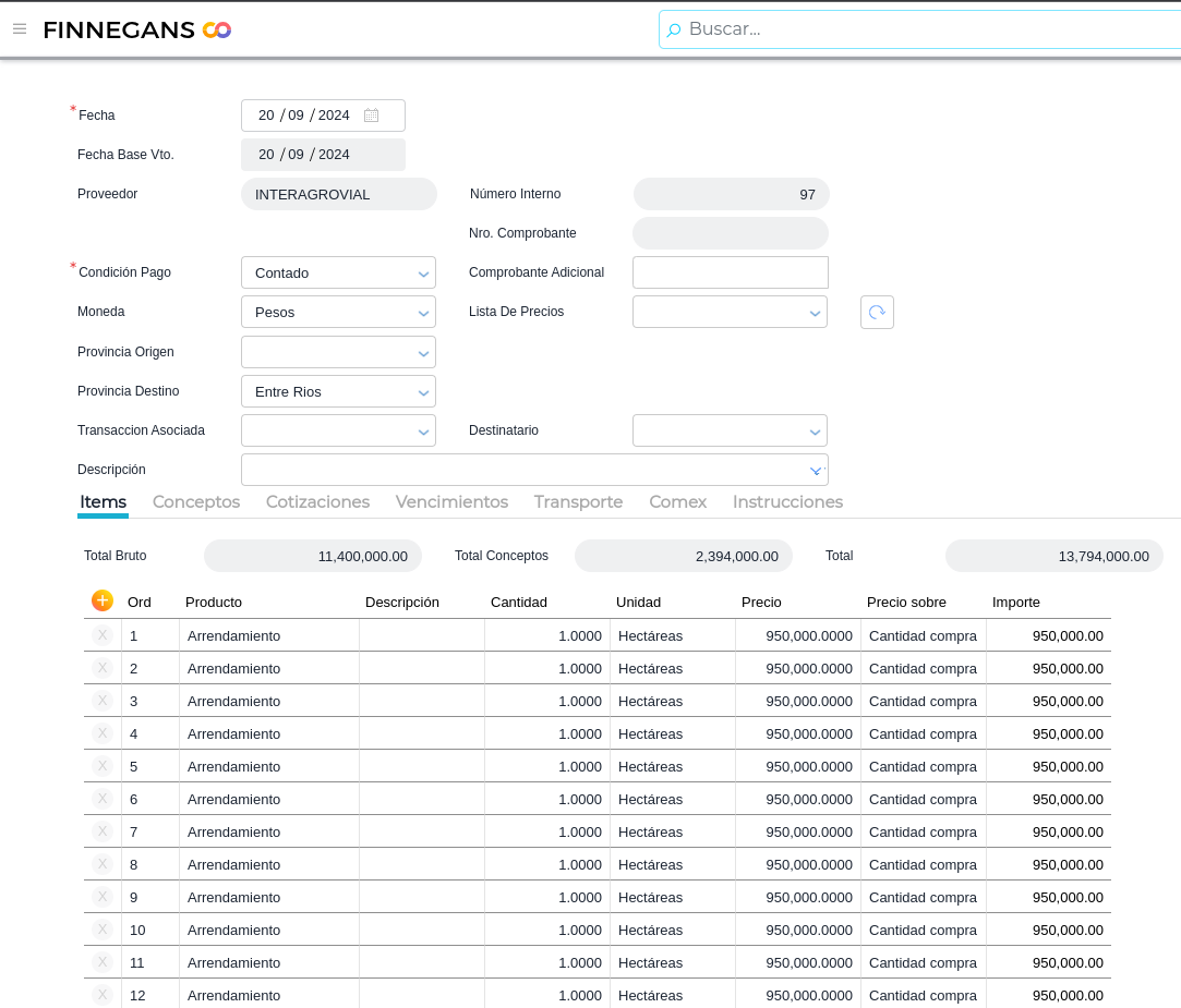 - Una vez dentro, cargar una orden de compra normal, seleccionado como proveedor a nuestro arrendador:
