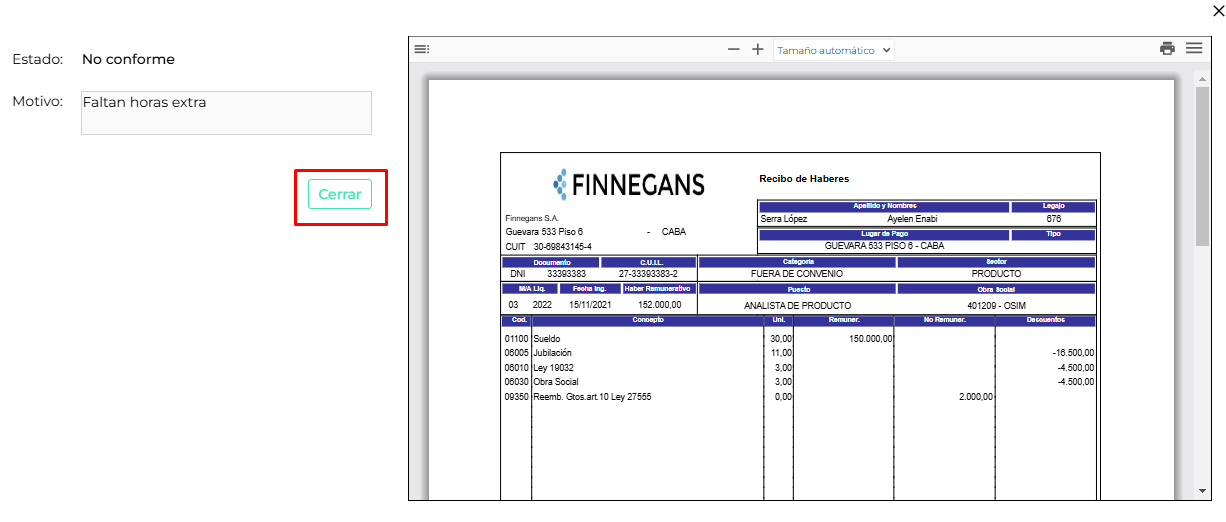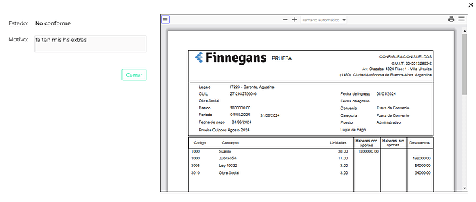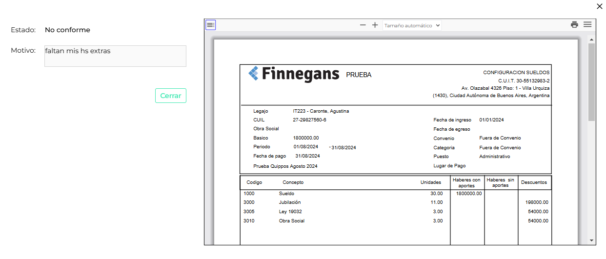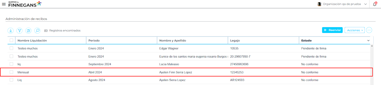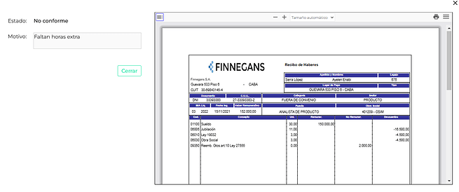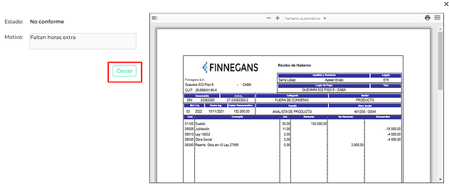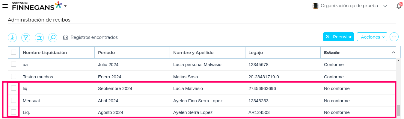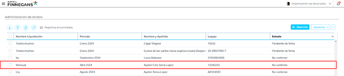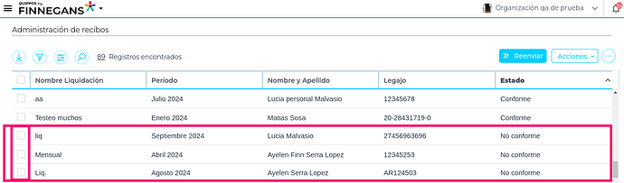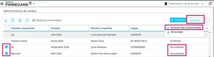 - Seleccionar los recibos de sueldo desde los checkboxes, los recibos deben tener el estado NO conforme.