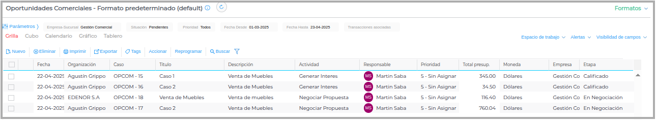 Para Entender los valores que se muestran en la imagen anterior analizaremos la información en Oportunidades Comerciales, ir a Menú → Gestión Comercial → Fuerza de Ventas → Oportunidades comerciales, en Parámetros filtramos por Estado Pendientes: