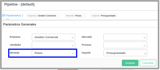Se trabajan las Oportunidades Comerciales y sus presupuestos en moneda extranjera, pero se quiere analizar el Pipeline en pesos para ello Ir a Menú → Gestión Comercial → Fuerza de Ventas → Pipeline, En los parámetros indicar moneda Pesos: