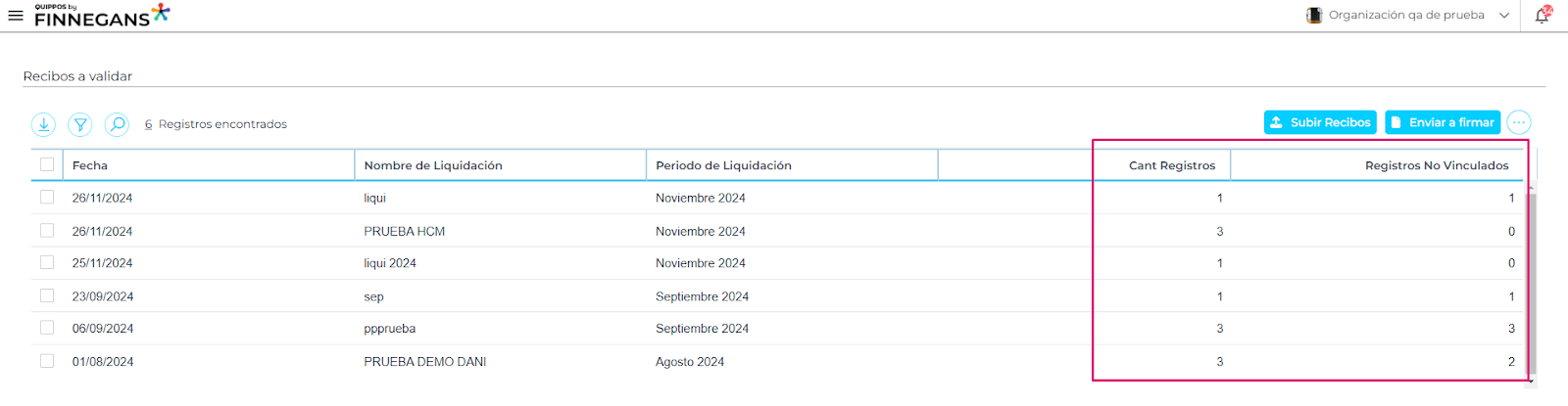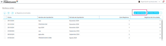 - La liquidación que se haya cargado se visualiza en grilla, indicará la cantidad de recibos de sueldo subidos y cuántos de estos fueron vinculados de manera automática.