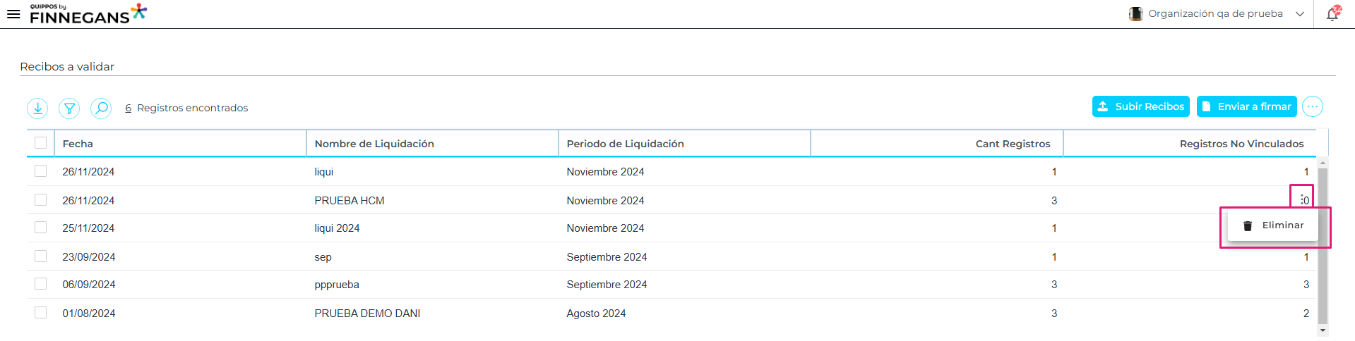 - Eliminar el registro desde los 3 puntos que se visualizan al lado derecho de cada registro