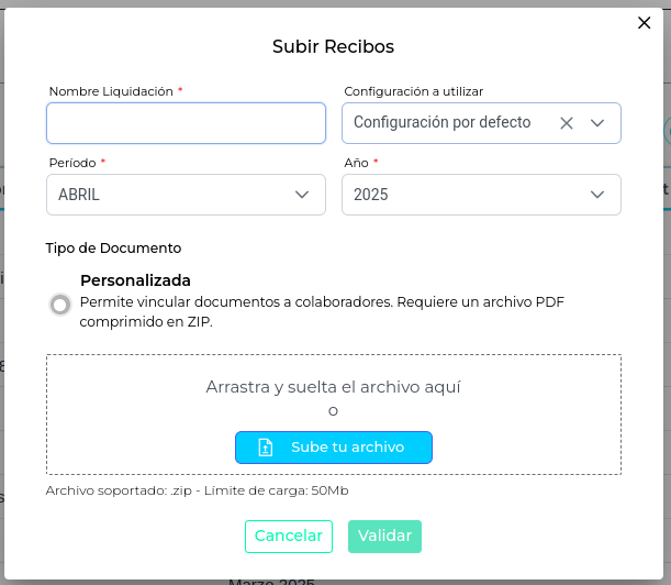 - Los recibos que se enviarán a firmar deben estar en formato PDF y comprimidos en un archivo ZIP. Cada PDF debe contener exclusivamente un recibo de sueldo, independientemente de la cantidad de hojas que tenga, y corresponder a un único colaborador.