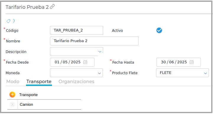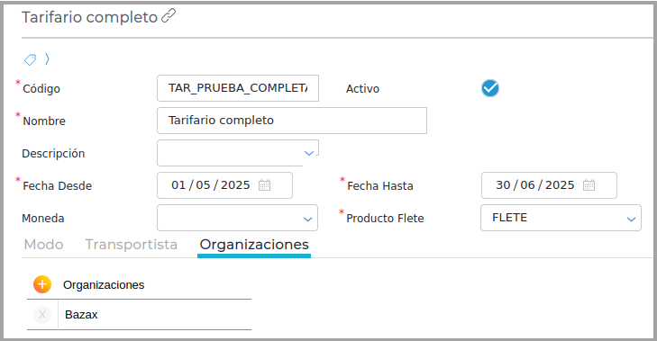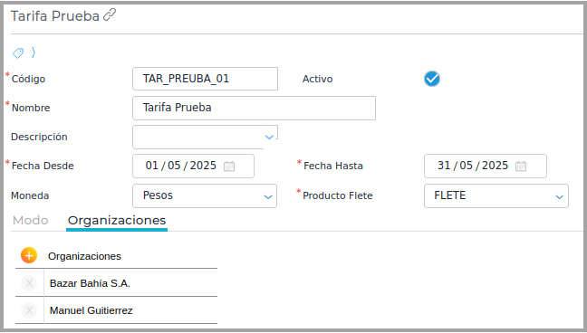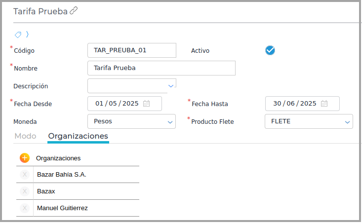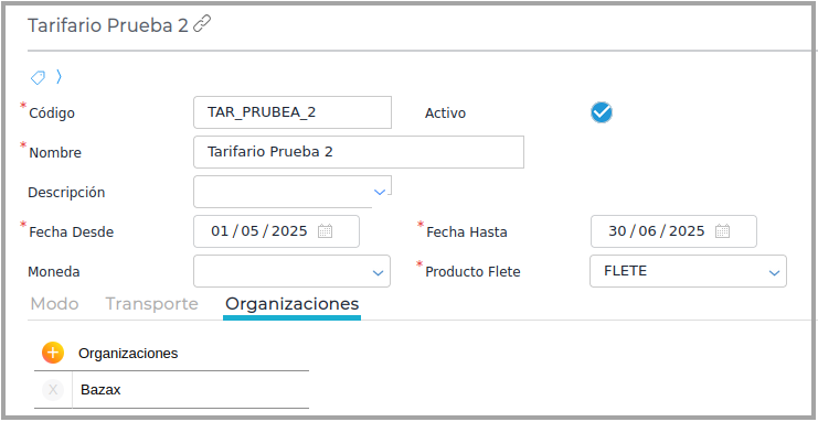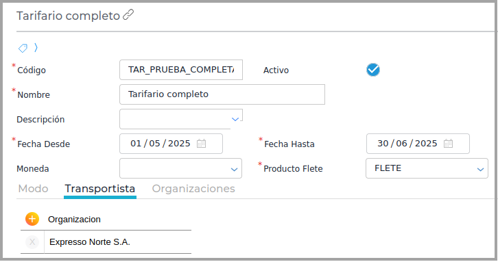 Se debe configurar dentro del maestro Tarifarios de Transporte, en solapa, modo que maneja Organizaciones, esto permite habilitar la solapa organizaciones, permitiendo seleccionar aquellas que podrán utilizarlo. De esta manera, en el campo tarifario de la solapa transporté de una operación, filtrará los tarifarios teniendo en cuenta la organización seleccionada.