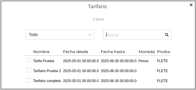 - Se cumple la condición donde organización = Bazax y transportista = Expresso Norte S.A., muestra tarifario “Tarifario Completo”