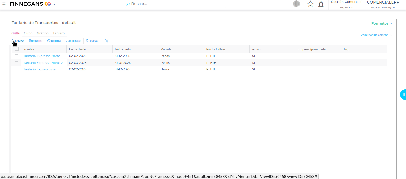 Ir a Menú → Gestión Empresarial → Inventarios → Tarifarios de Transporte, crea un tarifario nuevo, dentro de la solapa modo darle al check “maneja organizaciones”. Esto habilitaría la solapa organizaciones donde, desde el selector, deben seleccionar las organizaciones.
