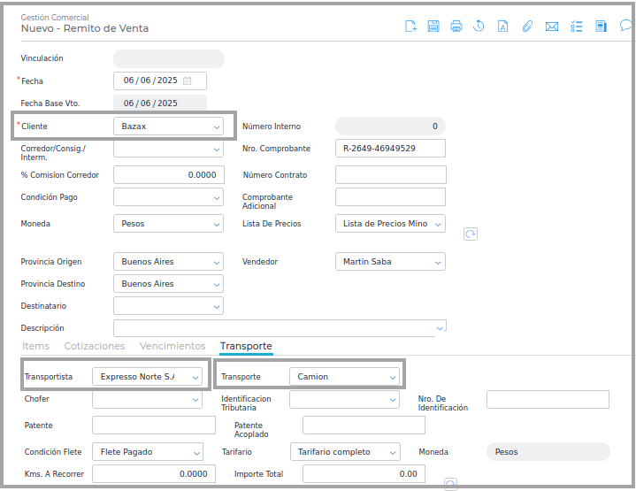 Ir a Menú → Gestión Empresarial → Ventas → Despachos, crear un Remito de Venta. Seleccionar una organización, en la solapa transporté, seleccionar un transportista y un transporte, en el campo tarifario se van a visualizar los casos donde: