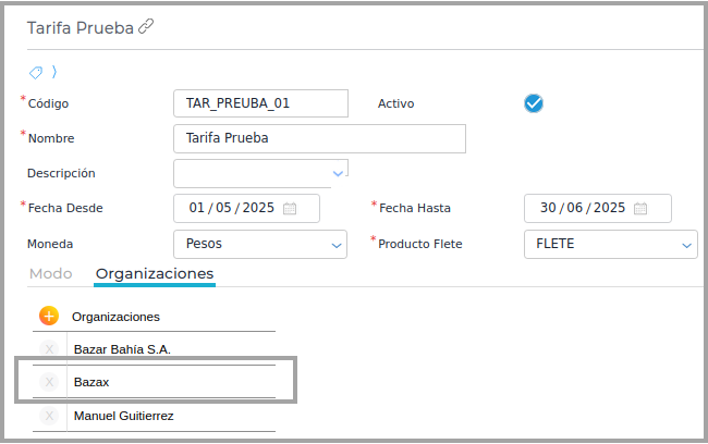 - Se cumple la condición donde organización = Bazax, muestra tarifario “Tarifario Prueba”