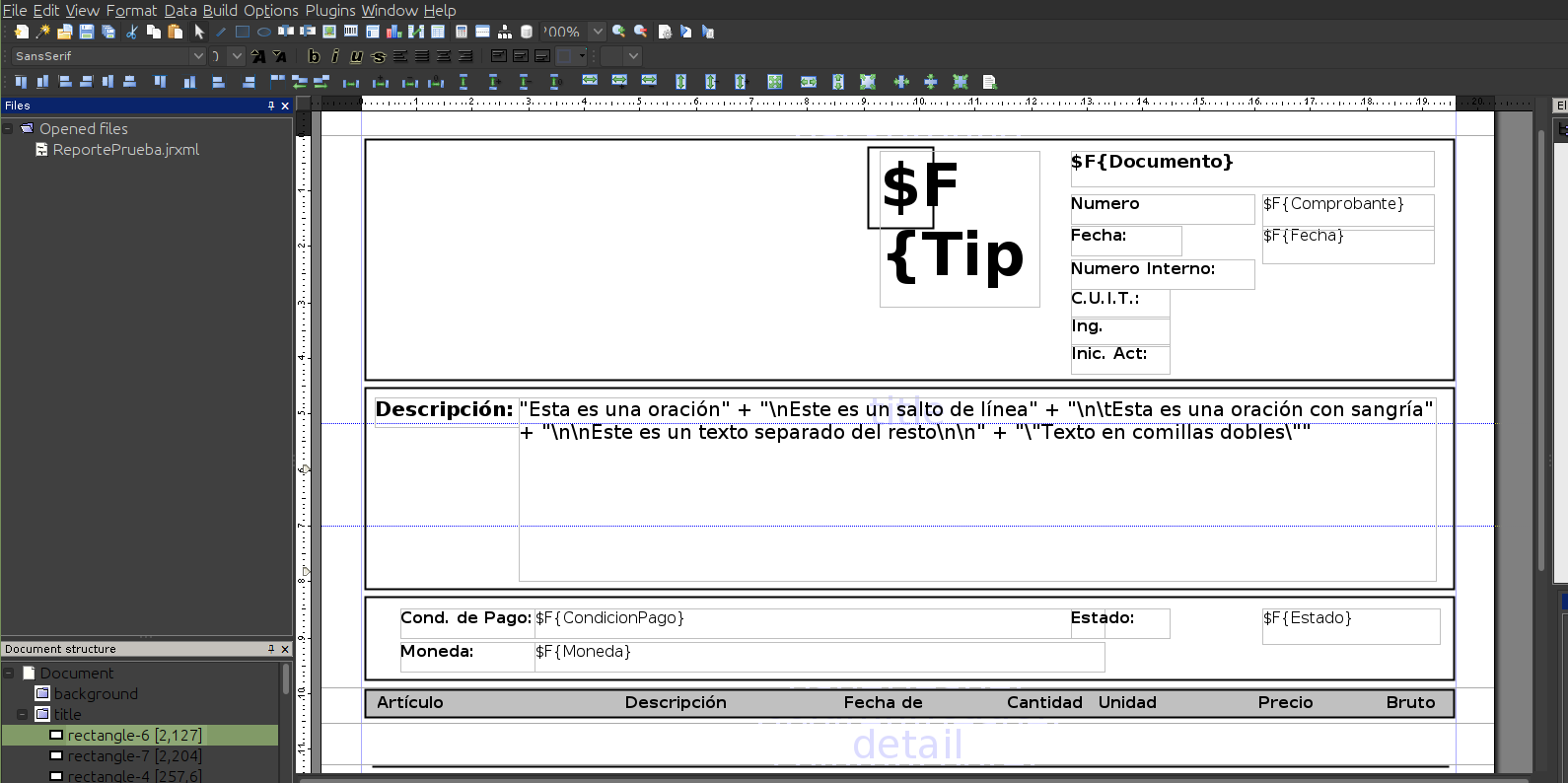 Desde la toolbar de iReport, utilizamos la herramienta ‘Text Field’, mantenemos pulsado el botón izquierdo del mouse desde un punto, y lo expandimos según nuestra elección.