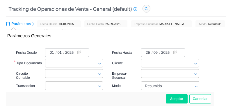 Ruta: Menú → Gestión Empresarial → Informes → Más informes → Tracking de Operaciones de Venta -