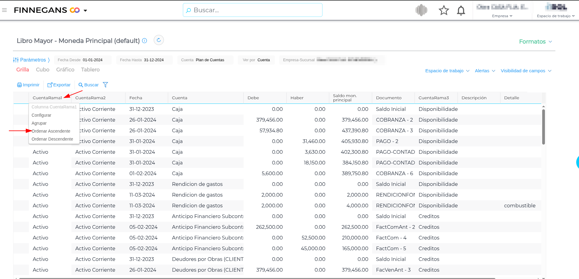 - Selecciona Ordenar de forma ascendente para ordenar las cuentas según la primera rama del plan de cuentas.
